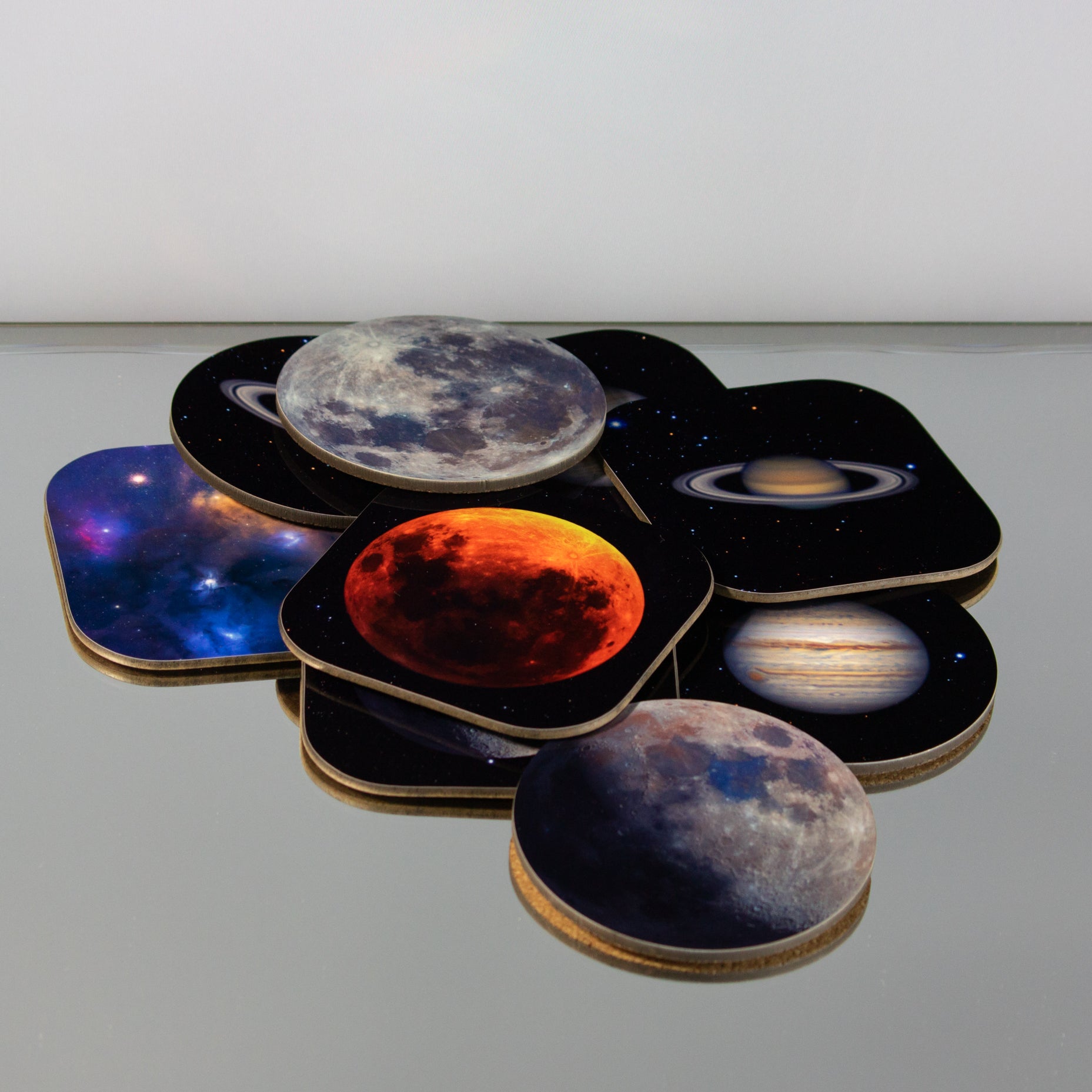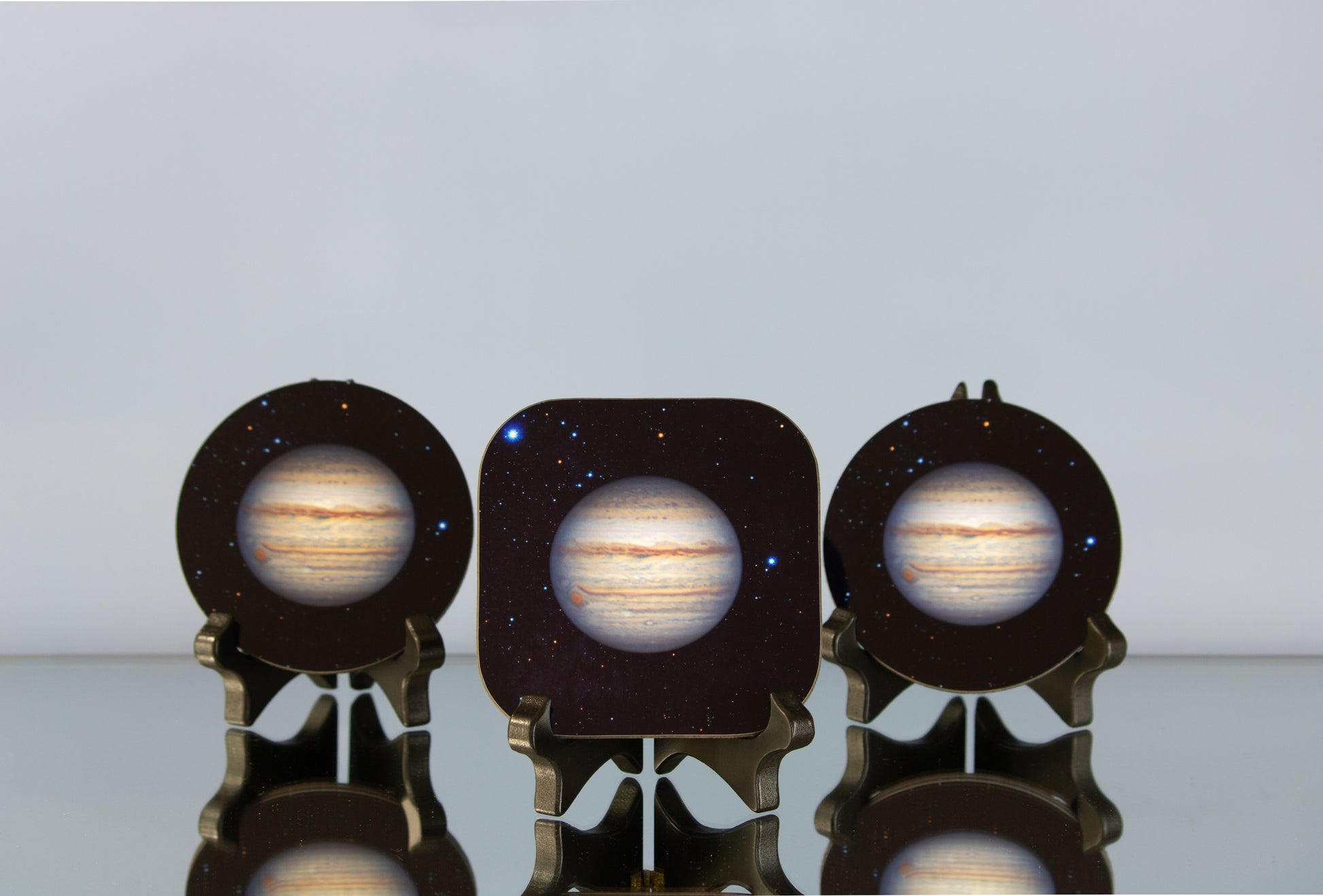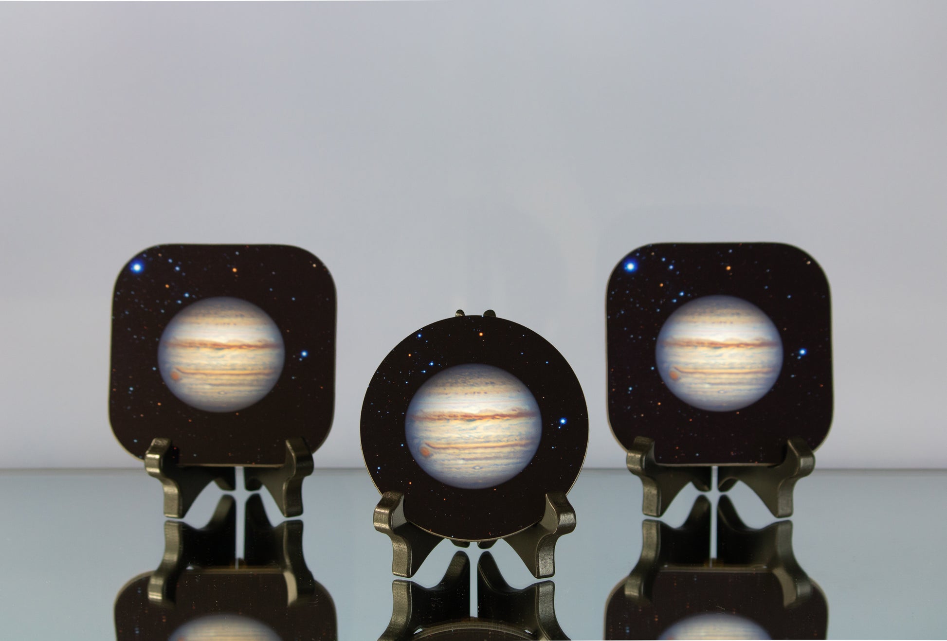 The intricate colors and patterns on these coasters are truly remarkable. As you gaze at these coasters, you'll find yourself wondering what it would be like to fly by this massive planet. Each coaster features storms and cloud structures captured by my own telescope and camera equipment, so you can enjoy a piece of the beauty of Jupiter in your own home.